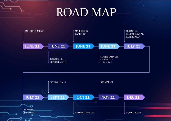 June 2021[ 1 ] Announcement June 2021[ 2 ] Private Sale & IDO June 2021[ 3 ] Listing on Defi Exchange June 2021[ 4 ] Staking & Farming June 2021[ 5 ] Aggressive marketing July 2021[ 6 ] List on coinmarketcap & coingecko August, 2021[ 7 ] DEX & NFT